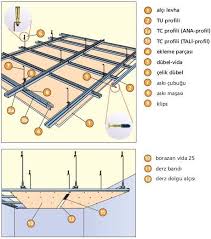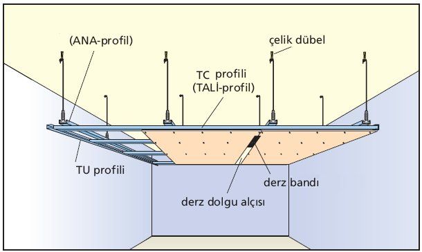 Mevcut döşemeye askı sistemiyle tutturulmuş metal iskelet üzerine alçı levhanın vidalanması ile oluşturulan Asma Tavandır.